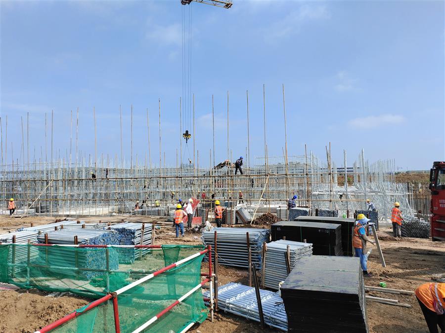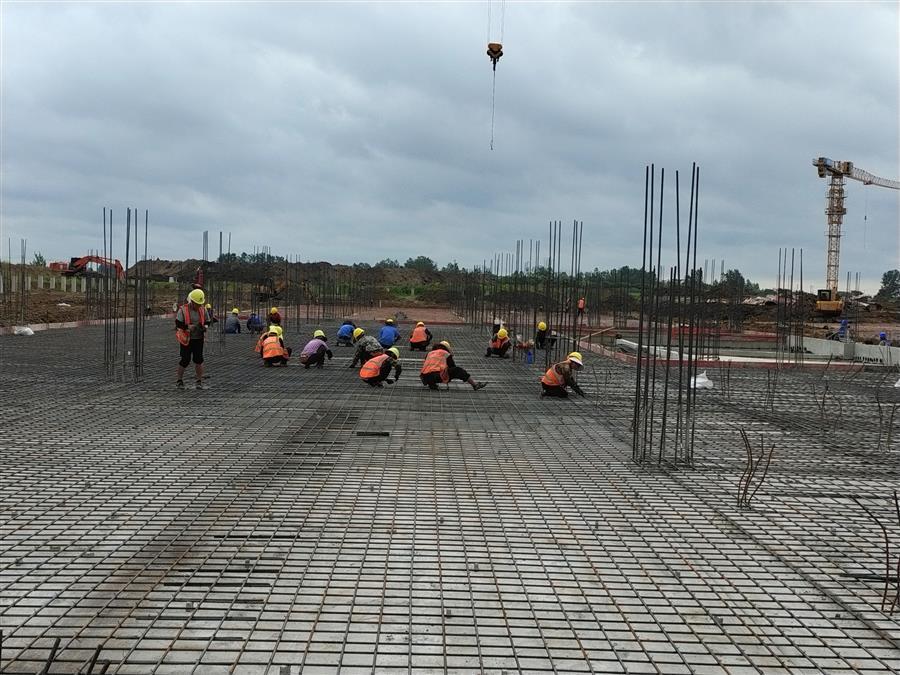 “日均投入施工技術(shù)人員500余人、各類機(jī)械設(shè)備45臺(tái)搶抓施工節(jié)點(diǎn)。”項(xiàng)目負(fù)責(zé)人禤旭云說,自6月開工以來,針對(duì)項(xiàng)目工期緊、任務(wù)重的情況,項(xiàng)目部按照“開工即攻堅(jiān)、起步即沖刺”的要求,全面推進(jìn)項(xiàng)目建設(shè)。目前,中試車間基礎(chǔ)回填、褥墊層鋪筑、墊層澆筑、剛性地面鋼筋綁扎完成;1#生產(chǎn)車間53~56軸獨(dú)基開挖基礎(chǔ)承臺(tái)鋼筋綁扎、模板安裝、砼澆筑完成,48~52軸基礎(chǔ)開挖、墊層澆筑完成;2#生產(chǎn)車間18~25軸基礎(chǔ)承臺(tái)鋼筋綁扎、模板安裝、砼澆筑完成;倉庫基礎(chǔ)梁全部完成。