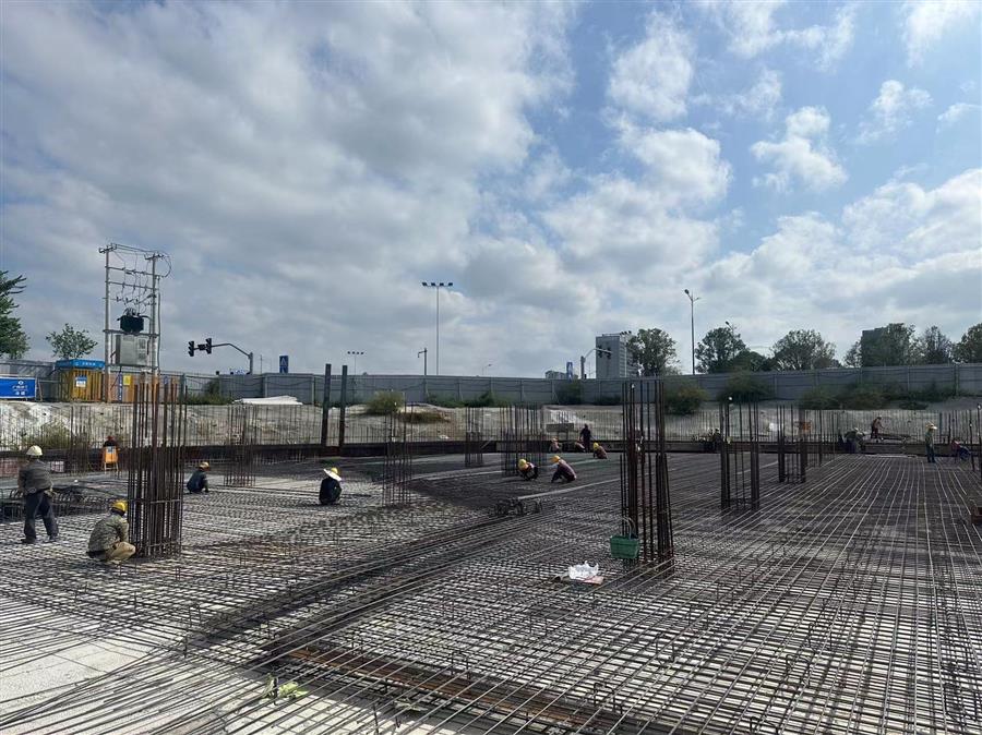 目前,項目塔1區(qū)域完成地下室頂板澆筑;塔2區(qū)域完成防水板鋼筋綁扎;塔3區(qū)域防水板鋼筋完成30%;塔1剩余區(qū)域完成基礎(chǔ)頂-防水板短柱澆筑;其他中庭區(qū)域完成98.77米大開挖。