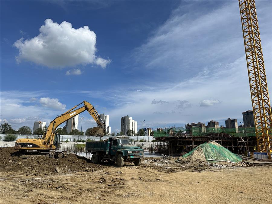 在農(nóng)投思賢幸福加項目,技術(shù)人員測繪、工人在綁扎鋼筋各作業(yè)面工作人員緊張忙碌地開展工作;施工機械運轉(zhuǎn)不停、運輸車輛來回穿梭,一派繁忙景象。