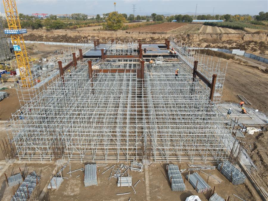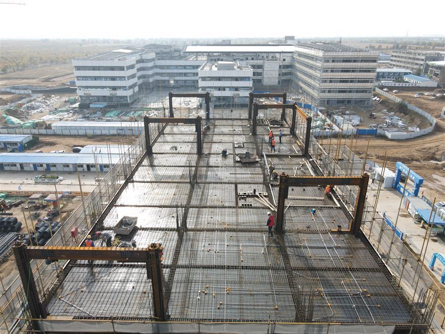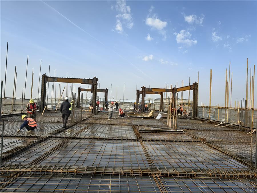 在施工現(xiàn)場(chǎng),到處可見(jiàn)建筑工人們忙碌的身影,大家分工合作,井然有序地進(jìn)行病房北樓梁板鋼筋綁扎、水電消防線(xiàn)管預(yù)埋、鋼結(jié)構(gòu)吊裝、醫(yī)技區(qū)東段盤(pán)扣架搭設(shè)、汽車(chē)坡道混凝土澆筑等工作面施工,各作業(yè)面協(xié)同推進(jìn),現(xiàn)場(chǎng)掀起“大干”熱潮。