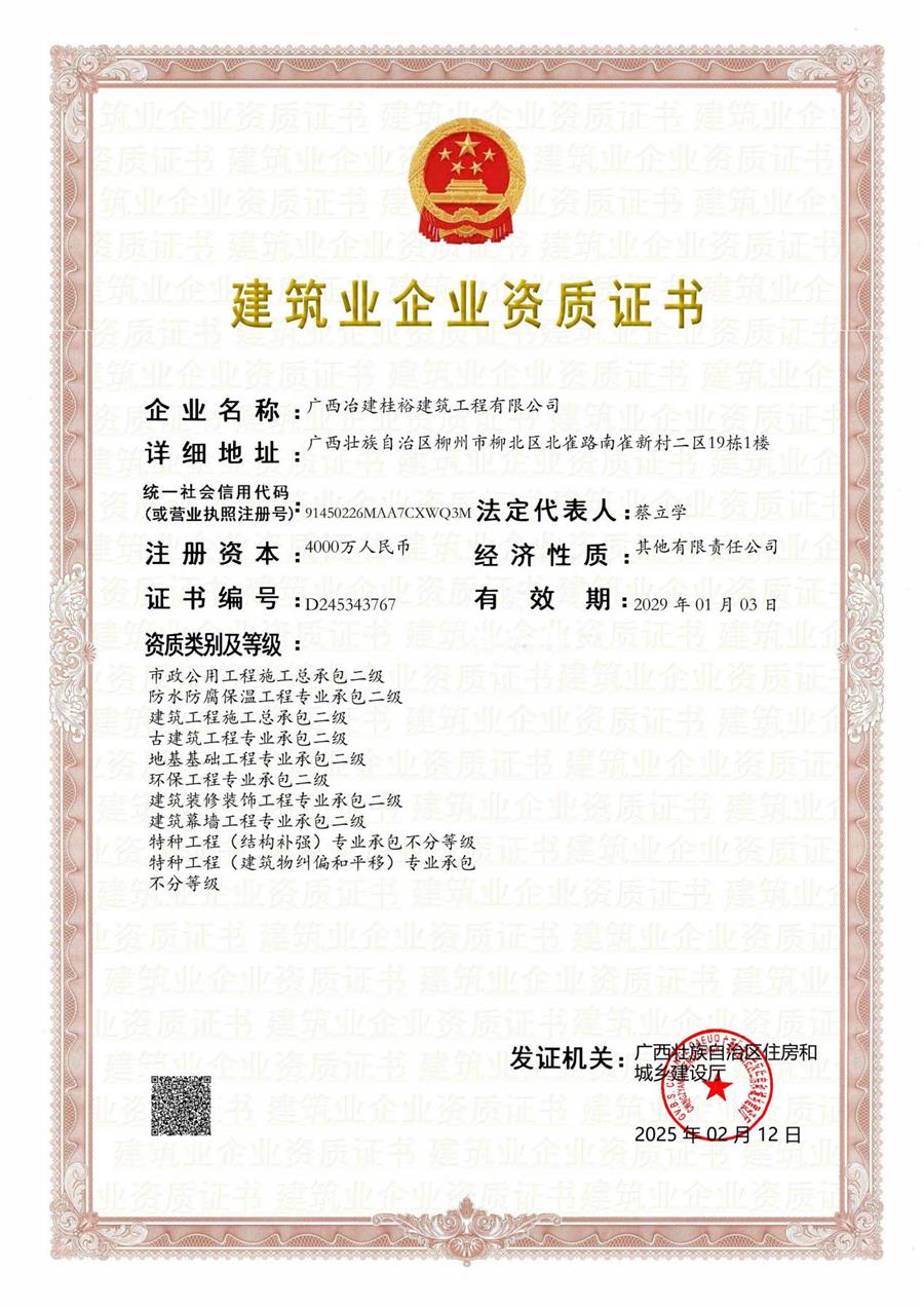 8項(xiàng)專業(yè)承包資質(zhì)分別是:防水防腐保溫工程、古建筑工程、地基基礎(chǔ)工程、環(huán)保工程、建筑裝修裝飾工程、建筑幕墻工程、特種工程(結(jié)構(gòu)補(bǔ)強(qiáng))、特種工程(建筑物糾偏和平移)專業(yè)承包資質(zhì)。此批資質(zhì)將為桂裕公司后續(xù)的業(yè)務(wù)承攬、拓展區(qū)域市場(chǎng)提供有力保障,為冶建公司高質(zhì)量發(fā)展添磚加瓦。