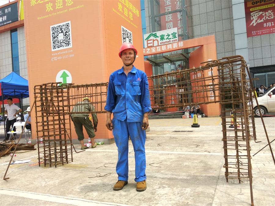 8月31日,在柳州家居建材博覽中心室外廣場(chǎng)上,一群頭戴安全,身著工裝的農(nóng)民工在各自忙碌著,不時(shí)傳來(lái)“叮叮?!变摻钆鲎猜?、“嘩嘩嘩”刨木聲、“咚咚咚”敲磚聲……伴隨著一片熱鬧的聲響,柳州市第四屆農(nóng)民工技能大賽暨柳州市第三屆農(nóng)民工家庭服務(wù)業(yè)大賽火熱舉行。