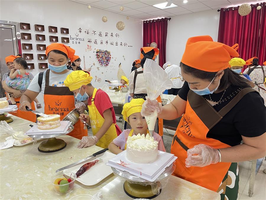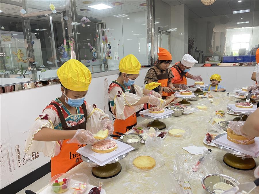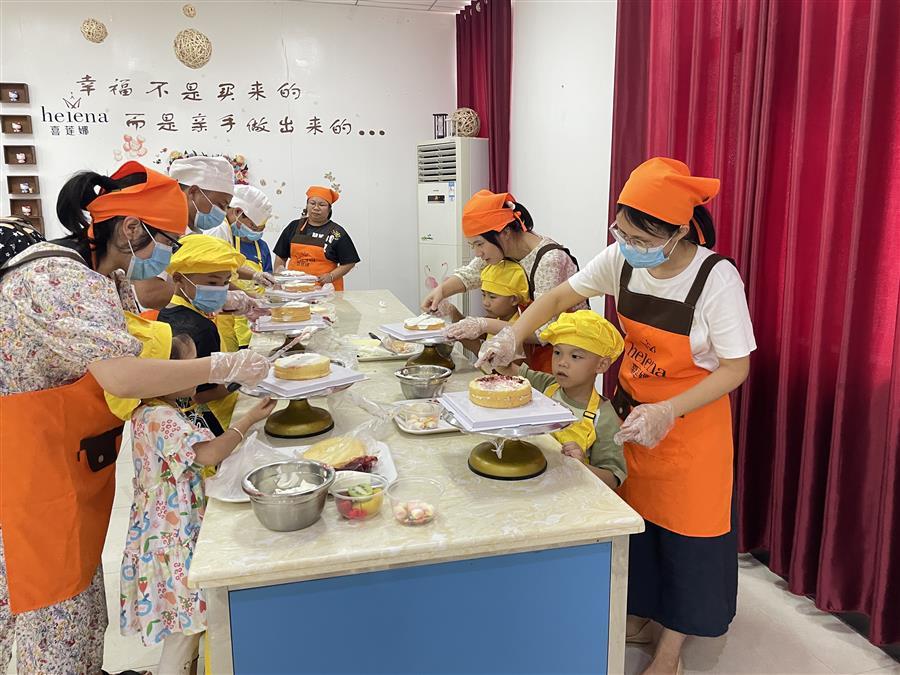 活動(dòng)現(xiàn)場,家長和孩子們聆聽了紅色詩歌朗誦,現(xiàn)場共同繪制了主題畫作。并在講解員的帶領(lǐng)下參觀了中央工廠,了解了糕點(diǎn)生產(chǎn)過程。參觀后,大家一起觀看專業(yè)糕點(diǎn)師的現(xiàn)場教學(xué)并體驗(yàn)了蛋糕制作。一個(gè)小時(shí)后,一個(gè)個(gè)造型別致、想象奇特、富有童趣的親子蛋糕新鮮出爐。家長與小朋友們手捧自己制作的蛋糕拍照,現(xiàn)場氛圍其樂融融。